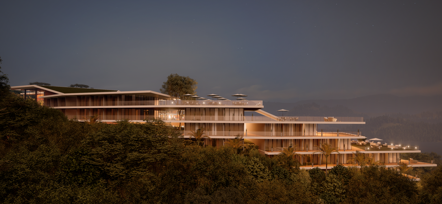 Situada em uma área nobre, o terreno acomoda um resort de alto padrão, e possui em sua paisagem, parte da serra do mar. Projeto se desenvolvem vários deques em níveis deferentes contemplando a área de lazer, e os volumes escalonados, respeitando a paisagem e o declive natural do terreno.