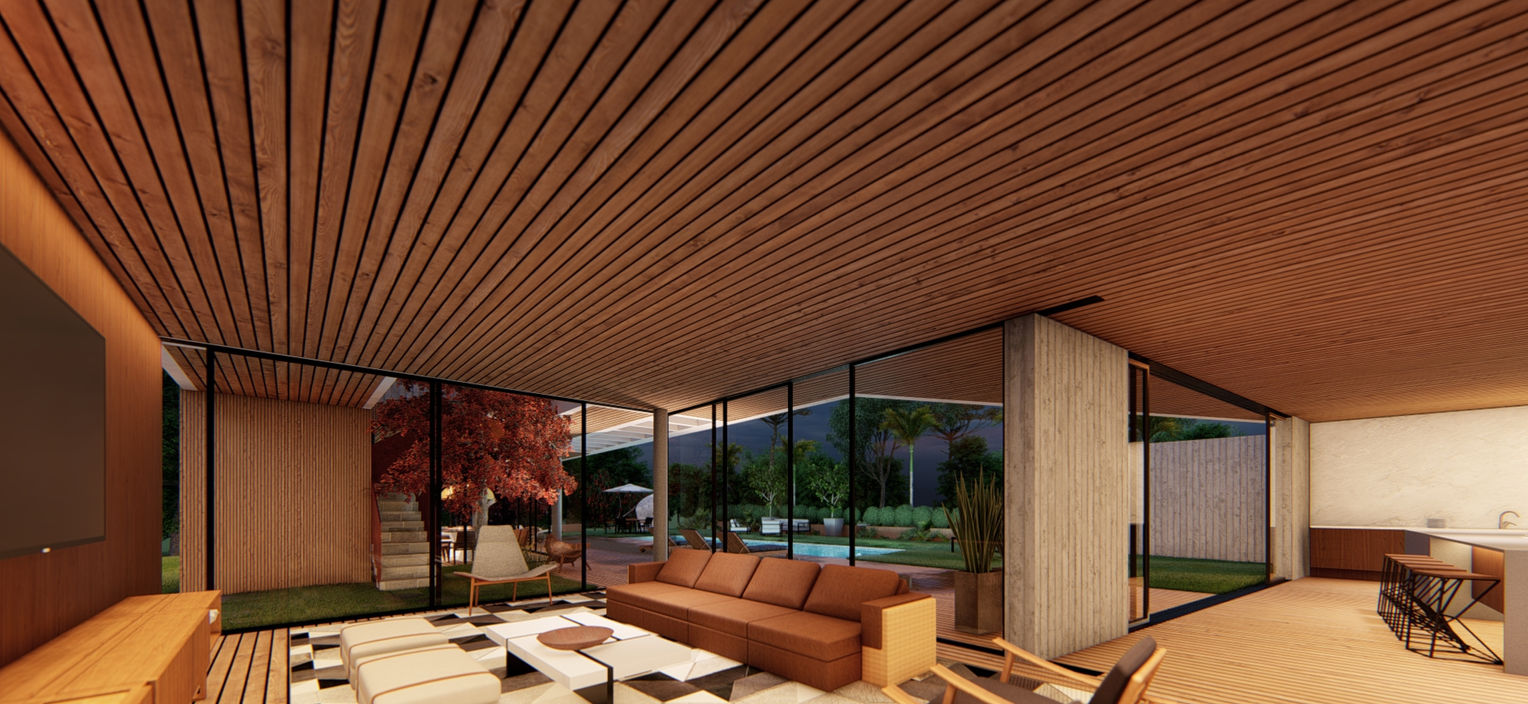 O projeto se destaca pelo volume irregular, criando um pátio no centro da volumetria para uma quebra de continuidade das grandes abas, além de um deck com área gourmet e ampla piscina para receber a família e amigos.
